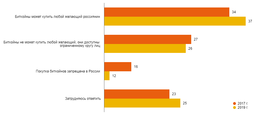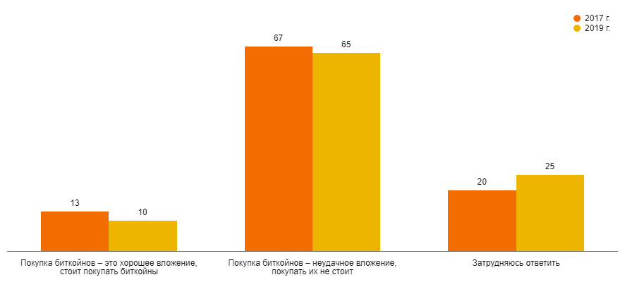 В целом, можно сказать, что биткойны пока не завоевали популярности среди наших сограждан: две трети россиян, слышавших о них (65%), считают вложение денег в биткойны невыгодной инвестицией, лишь 2% покупали биткойны.
