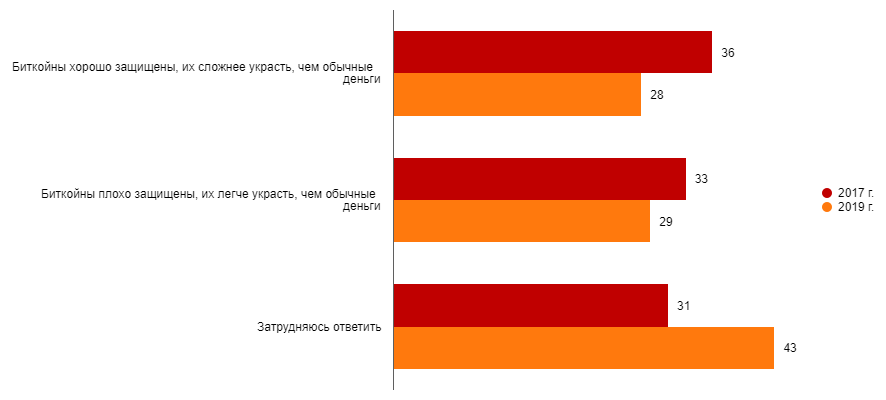 При этом фактические знания об этой криптовалюте довольно слабые. Так, среди тех, кто знает/слышали о биткойнах, 37% уверены, что их может приобрести любой желающий, а 12%, к примеру, считают, что они запрещены в России. Степень защиты биткойнов, по сравнению с обычными деньгами, оценивается неоднозначно: 28% полагают, что цифровую валюту украсть труднее, 29% - проще.