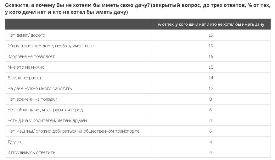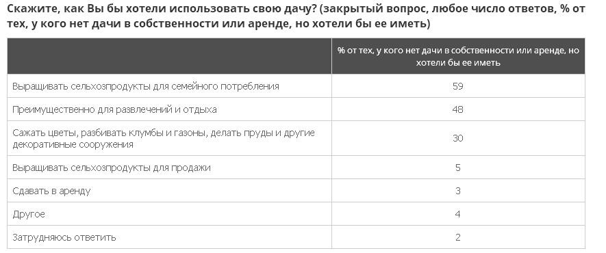 Желание купить дачу чаще всего мотивировано желанием выращивать на там сельхозпродукты (59%), развлекаться или отдыхать при выезде за город (48%), а также заниматься декоративным оформлением участка (30%). Отказ от покупки респонденты чаще всего объясняют отсутствием средств, проживанием в частном доме, а также проблемами со здоровьем.