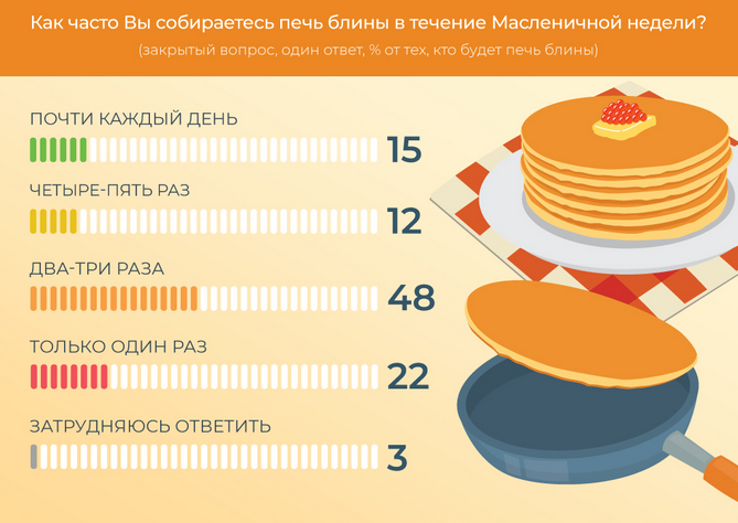 Из года в год самым популярным занятием на масленичной неделе остается поедание блинов — в этом году планируют заниматься этим 88% россиян. Доля планирующих готовку блинов при этом ниже на 10 п.п. — 78%.