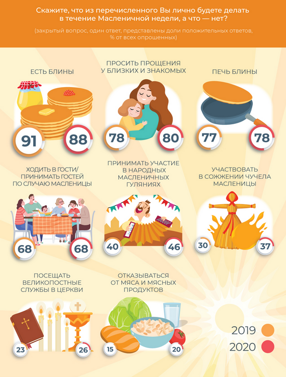 Традиции, известные нашим соотечественникам, реализуемые в Масленичную неделю, разнообразны. Более половины россиян сообщают, что на этот праздник принято сжигать чучело зимы, почти каждый пятый считает, что народные гуляния являются традиционным времяпрепровождением, связанным с этим событием. Также россияне называли масленичными традициями походы в гости и встречи с близкими, спортивные игры и кулачные бои, а также традицию забираться на столб или водить хороводы.