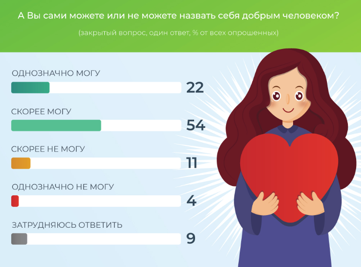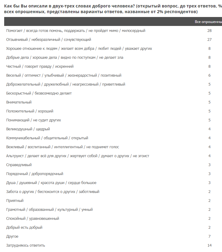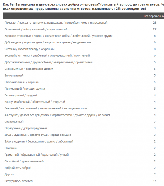 По мнению опрошенных, добрый — это тот, кто готов помочь и поддержать, а также отзывчивый, небезразличный к другим человек. Добрый человек любит людей, совершает хорошие дела и говорит правду. При этом три четверти россиян считают, что нельзя отнести к добрым людям тех, кто проявляет доброту исключительно к своим близким, не к остальным людям.