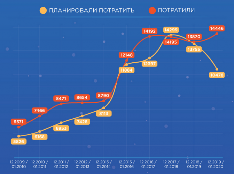 В этом году россияне потратили на празднование Нового года в среднем 14 446 рублей, что на 4% больше, чем траты в прошлом году (13 870 руб.). Из этой суммы на новогодний стол потратили в среднем 4 708 рублей, а на подарки друзьям и близким — чуть больше (5 505 руб.).