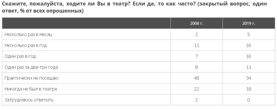 Если в 2008 году с той или иной периодичностью ходили в театры 28% опрошенных, то на сегодняшний день их больше на 20%. Только 34% респондентов практически не посещает театры, а каждый пятый участник опроса никогда не был в нём.