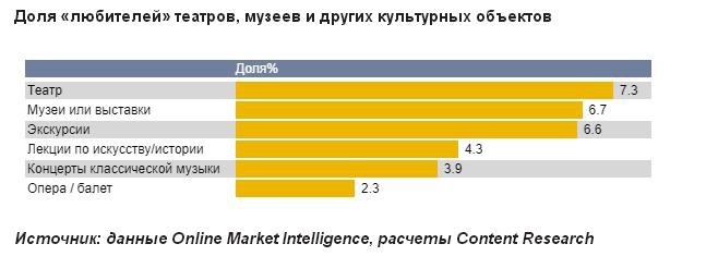 Отметим, что театр является традиционным лидером среди объектов культурной жизни россиян. Доля «любителей» составляет 7,3%, согласно данным Online Market Intelligence и расчетам Content Research.
