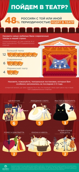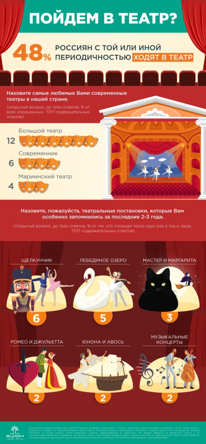 12% опрошенных назвали любимым современным театром страны Большой театр. В топ-3 также вошли «Современник» (6%) и Мариинский театр в Санкт-Петербурге (4%). Кроме того, респонденты посещали Ленком, Малый театр, МХАТ, Театр на Таганке, Театр сатиры (по 3%), Театр им. Е.Б. Вахтангова, Московский театр Олега Табакова и Театр юного зрителя (по 2%) и другие.