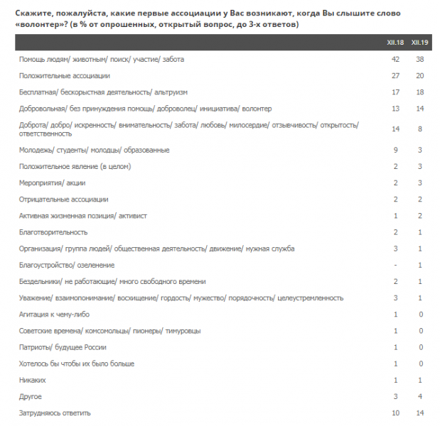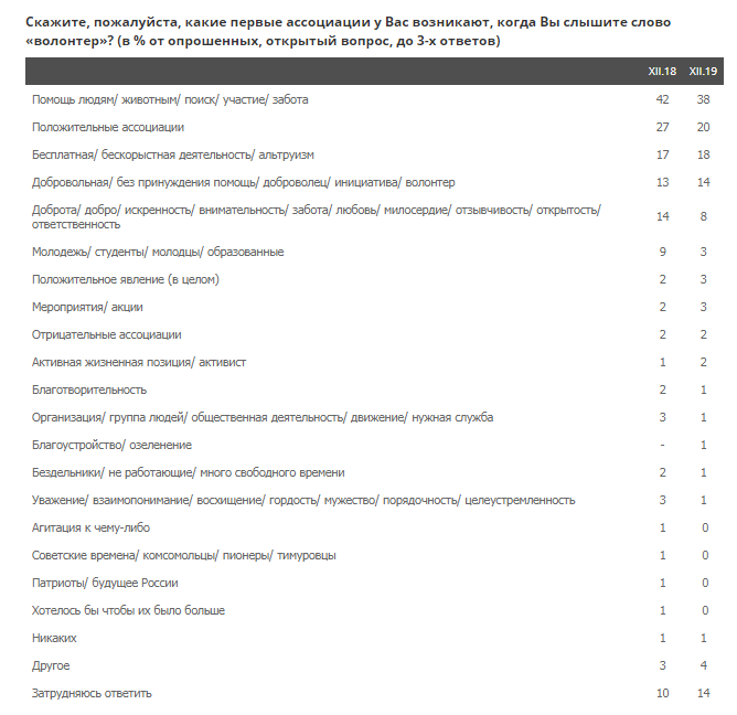 Три четверти опрошенных полагают, что в последние годы люди занимаются добровольческой или волонтерской деятельностью больше, чем 10−15 лет назад. Показатель устойчиво растет: в 2008 году это мнение разделяли лишь 24% респондентов. И только 7% опрошенных заявили о сокращении волонтерского движения.