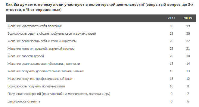 По мнению половины россиян, основной мотив деятельности волонтеров — желание чувствовать себя полезными. Также в группу ключевых мотивов волонтерской деятельности входят: «возможность решить общие проблемы свои и других людей», желание реализовать себя и свои инициативы, желание жить интересной, активной жизнью.