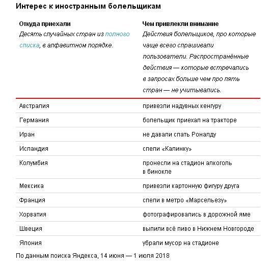 Японцы, сенегальцы и саудовцы произвели впечатление уборкой на стадионе, колумбийцы — алкоголем в бинокле, хорваты — фотосессией в дорожной яме. Шведы запомнились тем, что выпили все пиво в Нижнем Новгороде, а иранцы — тем, как не давали спать Роналду. Также россияне часто искали про купание уругвайцев, бельгийцев и португальцев в фонтане. А других интересовали болельщики, которые приехали на ЧМ на велосипеде.