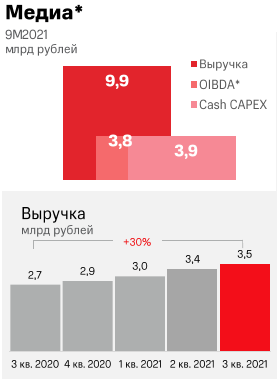 Показатель OIBDA направления медиа вырос в третьем квартале 2021 года по сравнению с третьим кварталом 2020 года на 25% до 1,2 млрд руб., что обусловлено ростом выручки. Общее количество абонентов платного ТВ увеличилось в третьем квартале 2021 года на 39,3% по сравнению с аналогичным периодом прошлого года до 7,8 млн пользователей. Количество пользователей ОТТ-платформы в третьем квартале 2021 года показало рост на 96,8% в годовом исчислении до 3,5 млн пользователей.