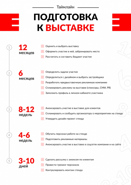 Проводить рекламную кампанию лучше в несколько этапов. Для посетителей из других городов отправляйте анонс за 8−12 недель, чтобы у них было время спланировать поездку. Если посетители из региона, где проходит мероприятие, то кампанию можно начинать за 4−6 недель. За неделю до выставки важно разослать финальное напоминание.