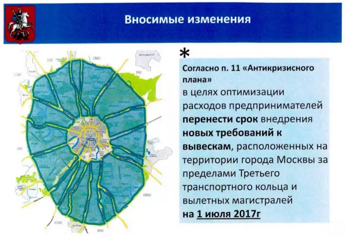 В феврале предприниматели попросили отсрочить обязательную замену вывесок на три года. Власти Москвы утвердили Антикризисный план, при этом снизив срок до одного года.