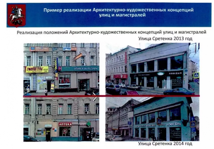 Новые правила размещения информационных конструкций утвердили в 2013 году. Сначала к единому дизайну привели вывески в пределах Садового кольца, затем - внутри ТТК. Упорядочить вывески за пределами ТТК и вылетных магистралей планировалось к 1 июля 2016 года.
