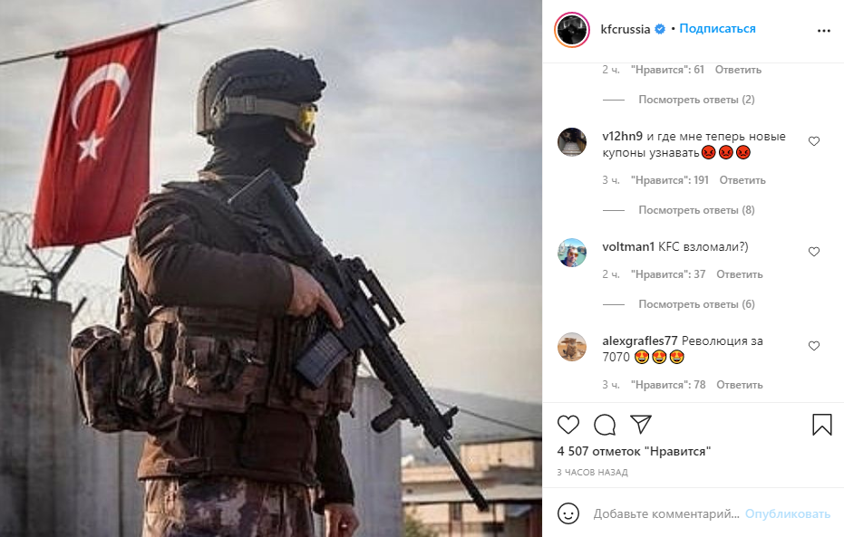 Instagram-аккаунт российского подразделения KFC был взломан. На странице появилась фотография вооруженного солдата на фоне флага Турции, а название аккаунта сменили на Fırat ~ Kaan. Подписчики потребовали от захватчиков вернуть им в ленту курочку и купоны на скидку.