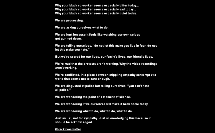 Пост начинается со слов: "Почему ваши темнокожие сотрудники особенно тихи и печальны сегодня…" и заканчивается словами: "Мы хотим знать, что нам делать. Просто для вашего сведения, не ради симпатии. Просто признавая, потому что нужно признать".