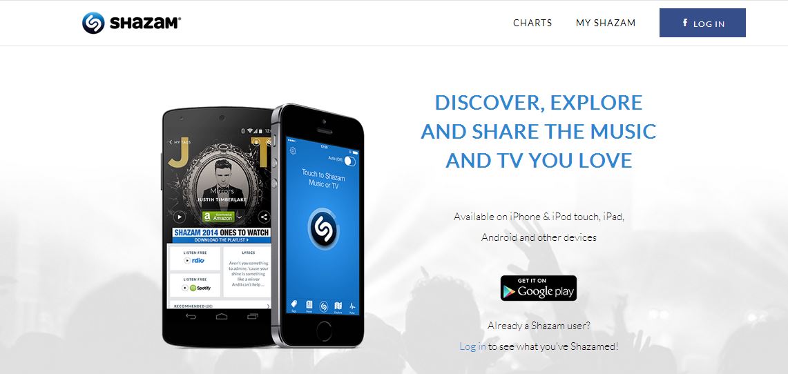 Приложение Shazam позволяет идентифицировать трек, который звучит на радио, ТВ или в общественных местах. Для звукозаписывающих компаний это важный маркетинговый партнер: при помощи Shazam пользователи делятся аудиороликами в соцсетях, переходят в магазин iTunes Store или стриминговые сервисы вроде Spotify.