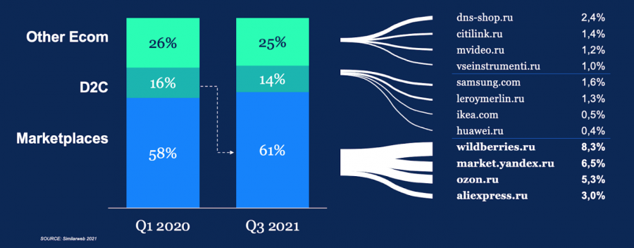 Маркетплейсы в России доминируют по количеству визитов пользователей среди всех площадок e-commerce. Сегодня их доля уже более 60%, и она продолжает расти, «отъедая» аудиторию у собственных каналов продаж брендов производителей (D2C). Маркетплейсы также становятся точкой входа, новым поисковым агрегатором для большей части аудитории. По статистике 58% открыли для себя и купили новые бренды, впервые увидев их на маркетплейсах.