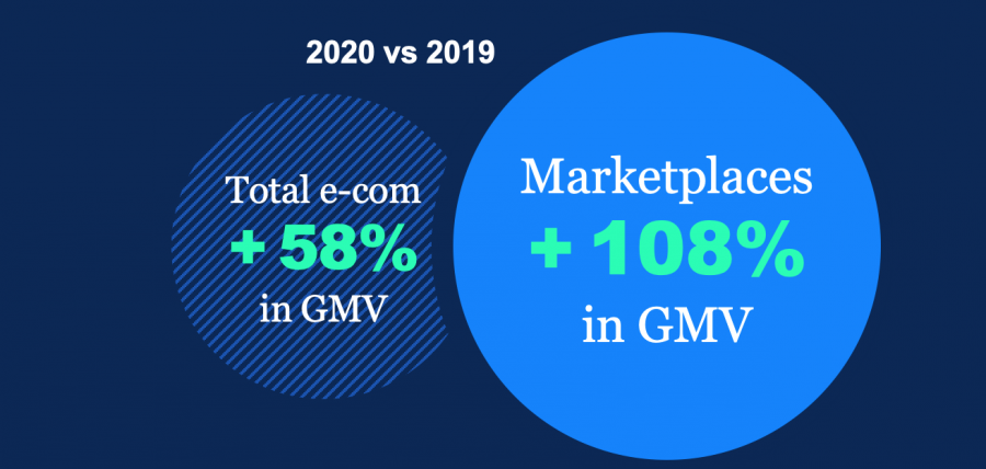 Пандемия оказала колоссальное влияние на потребителя и его привычки. В 2020-м году прирост e-commerce в России составил 58% — более половины заказов пользователи сделали через маркетплейсы. Таким образом, маркетплейсы стали ключевым драйвером роста электронной коммерции.