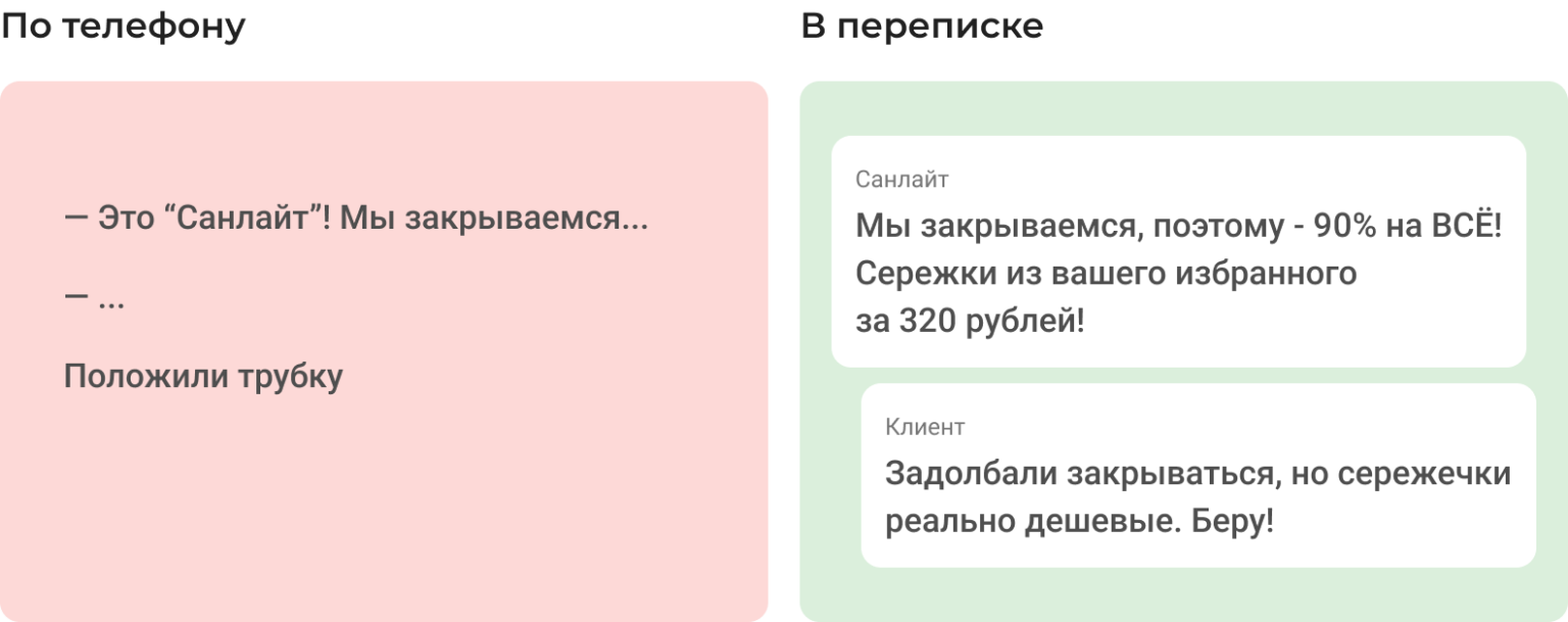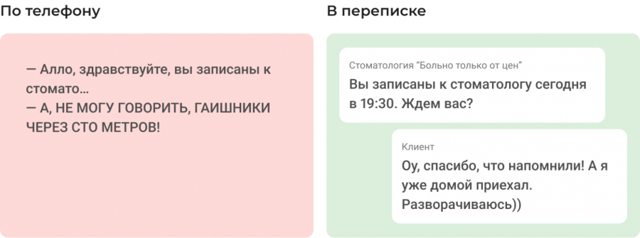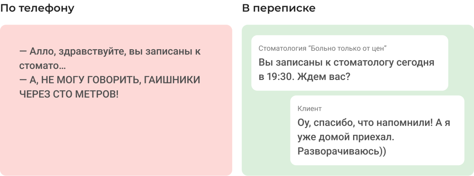 - Невозможно написать клиенту невовремя. Прочитать сообщение он может в пробке, на встрече, в салоне красоты — где угодно. И ответить тогда, когда соберётся с мыслями и обдумает все слова.
