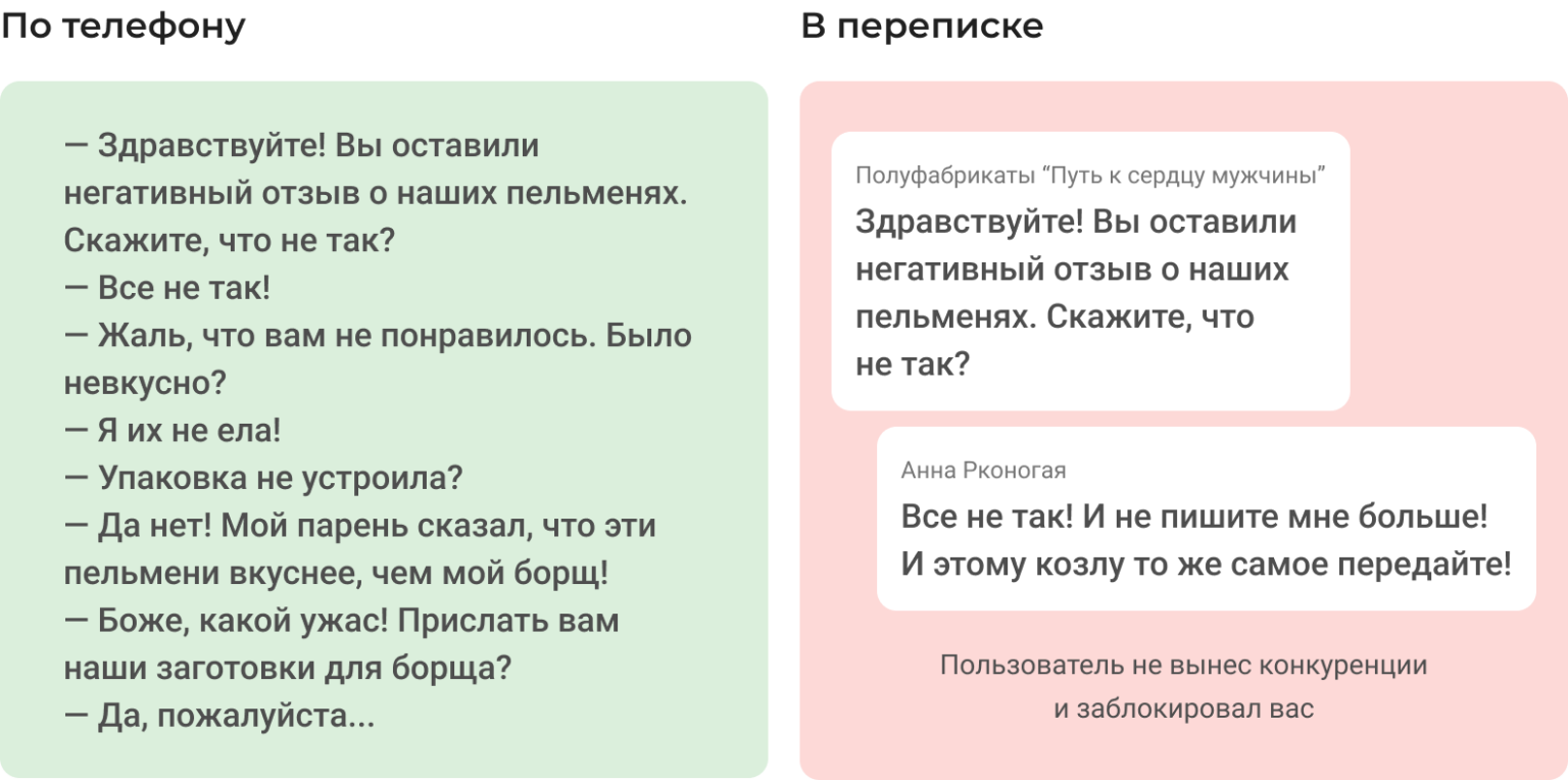 Да, работать с претензиями по телефону для менеджера сложнее и неприятнее, но намного эффективнее. К тому же, по телефону люди ведут себя более сдержанно, а в переписке могут запросто отправить в пешее эротическое. В результате получится сохранить клиента, и он не пойдёт фонтанировать гневными отзывами.