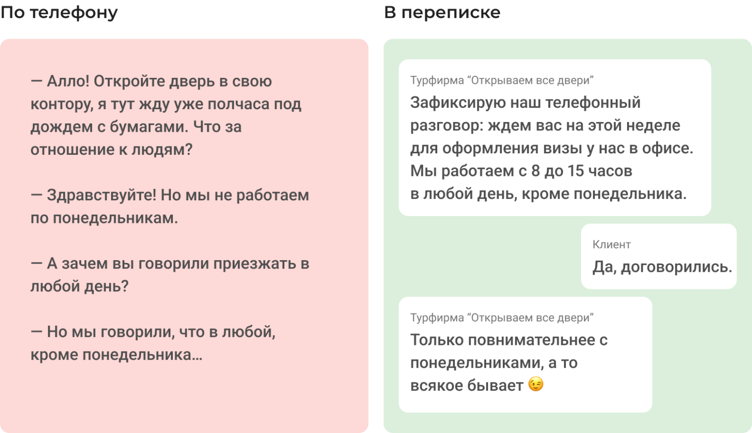 В переписке всё сохранится, поэтому следует дублировать договорённости в мессенджер. Так вы снизите вероятность, что клиент не выполнит свои обязательства или неправильно запомнит и учинит скандал. В результате всё это подтвердит качество сервиса и устранит недопонимания с клиентами.
