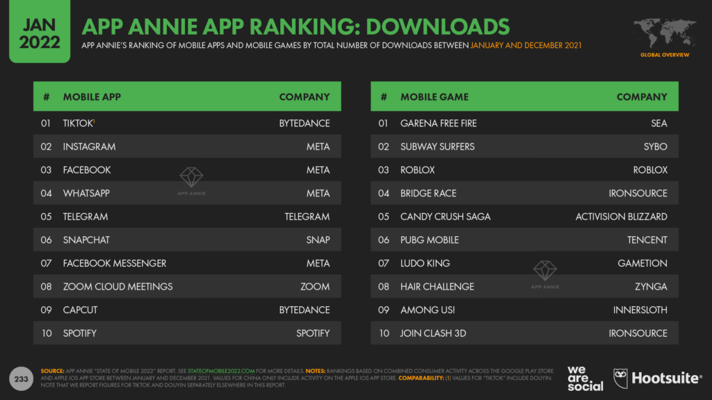Аналитики AppAnnie прогнозируют, что в 2022 году TikTok побьёт два рекорда: глобальное число скачиваний приложения превысит 3 млрд. Пользователи потратят в социальной сети $9 млрд на iOS и Google Play, что будет обусловлено встроенными покупками в приложении.