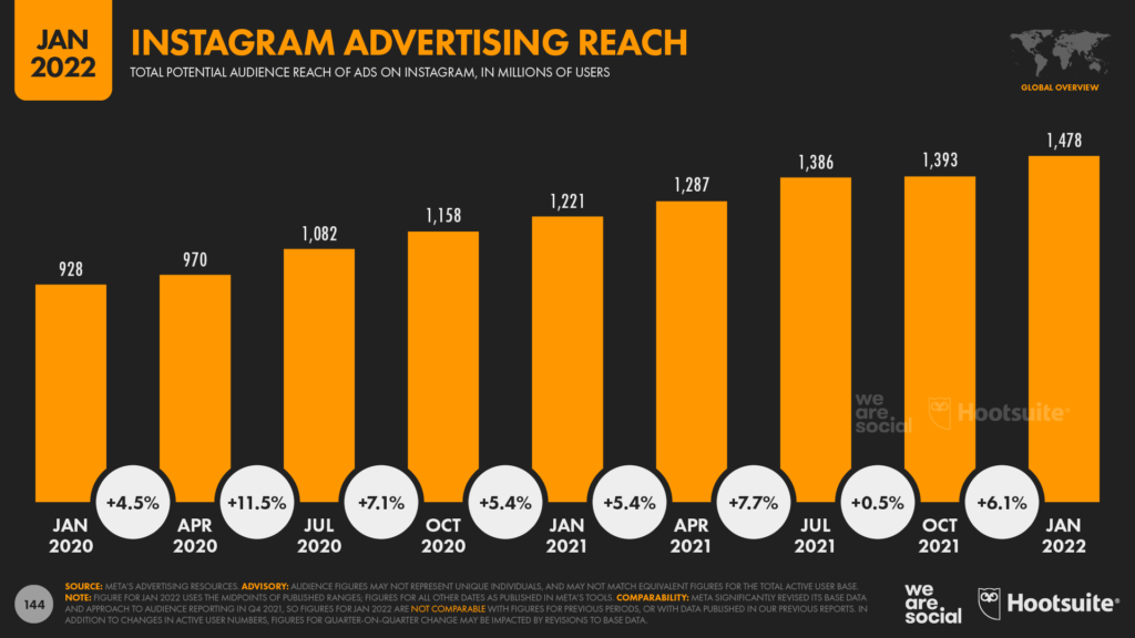 По данным Meta, за 2021 год охват рекламы в Instagram вырос на 21% — более 250 млн новых пользователей присоединились к платформе. К началу 2022 года охват глобальной рекламы платформы достиг почти 1,5 млрд пользователей.