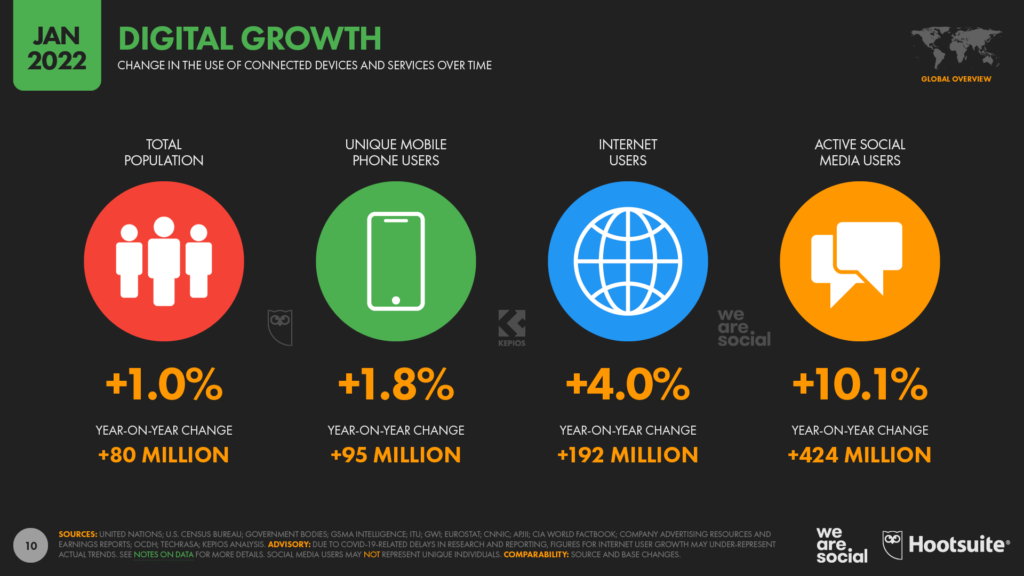 Сейчас средний юзер проводит в интернете почти семь часов в день, то есть более 40% своей бодрствующей жизни. По прогнозам аналитиков We Are Social, в 2022 году пользователи во всём мире могут провести в интернете более 12,5 трлн часов.