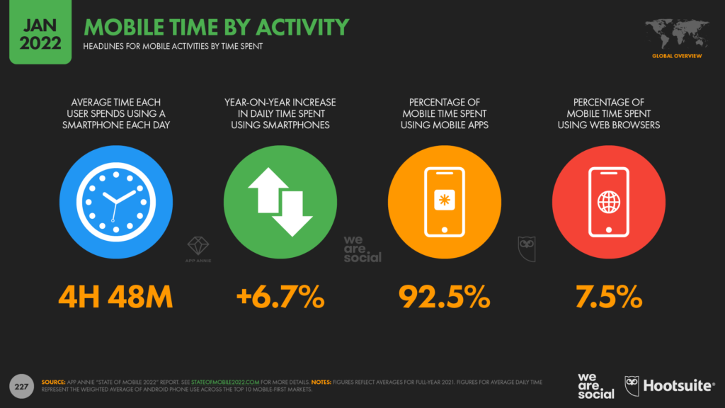 Средний юзер пользуется мобильным телефоном примерно пять часов в день. Это означает, что в 2022 году 5,3 млрд абонентов совокупно проведут более 1 млрд лет, используя мобильные телефоны, подсчитали аналитики We Are Social.