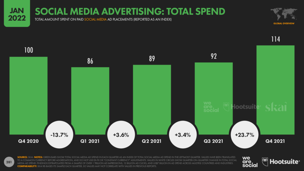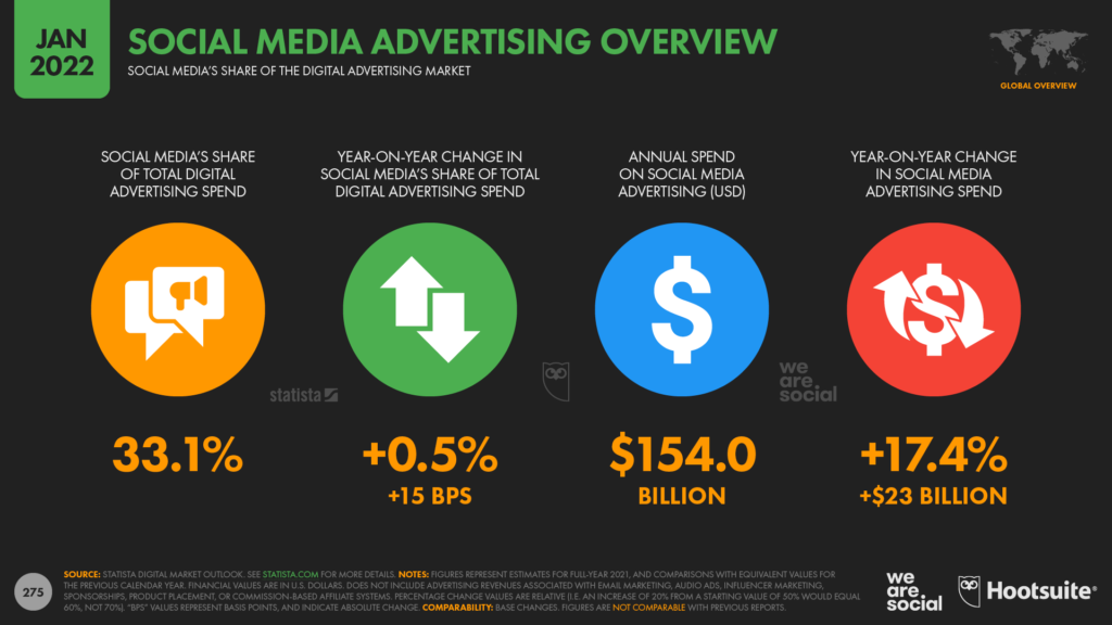 В 2021 году глобальные расходы на рекламу в соцсетях превысили $150 млрд, отмечают авторы. Это примерно 33,1% от общего объёма расходов на диджитал-кампании.