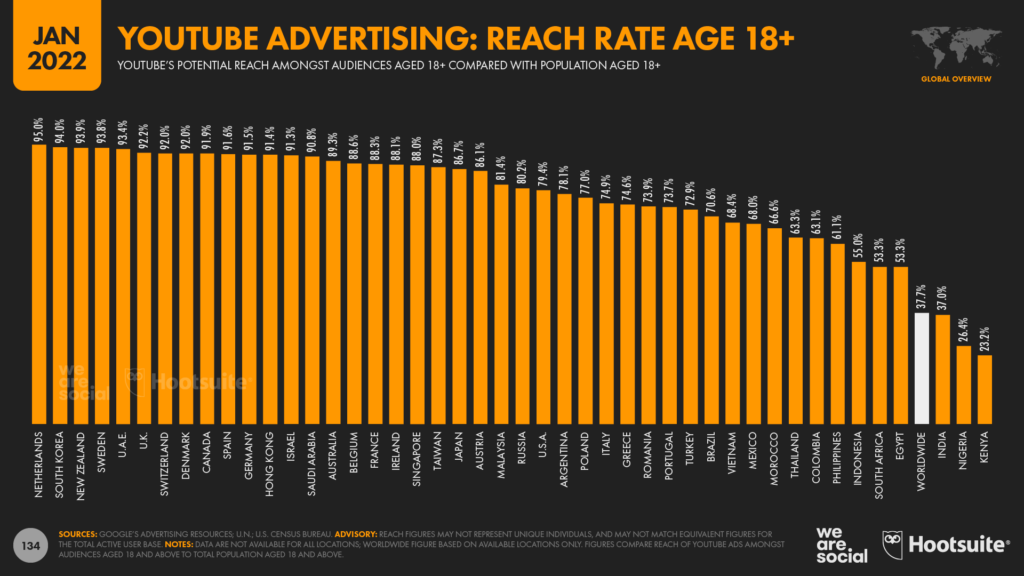 Согласно результатам отчёта, рекламу на YouTube ежемесячно видят более 2,5 млрд пользователей — это на 271 млн (11,9%) больше, чем в 2020 году. Сейчас рекламные ролики на видеосервисе смотрит примерно каждый третий человек на Земле. Среди аудитории от 18 лет и старше эта цифра возрастает до 37,7%.