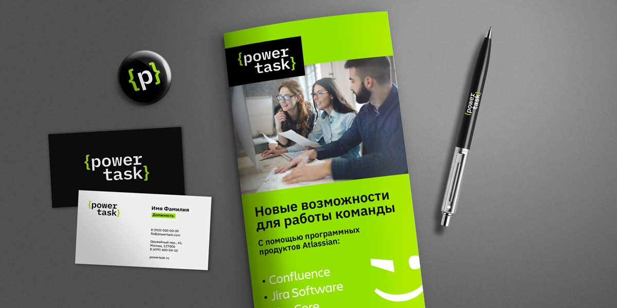 Основными цветами нового бренда стали «электрический» зеленый и черный цвета. Типографика логотипа PowerTask напоминает программный код, где фигурные скобки обычно выполняют функцию «объединения». Это позволило подчеркнуть идею синергии с клиентом и командной работы.