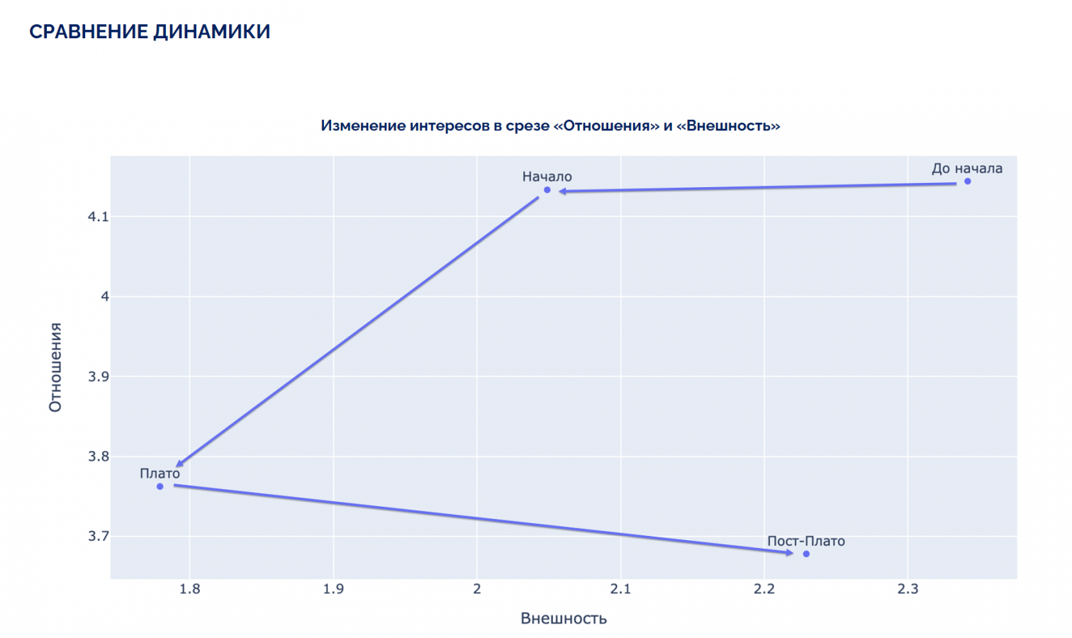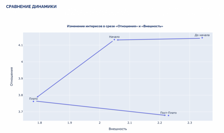 Результаты исследования показали, что шоковый период, когда большая часть интересов пользователей в онлайн-пространстве резко менялась, продлился около месяца, с конца февраля до конца марта. Далее происходила адаптация людей к ситуации, сокращение резких колебаний интересов и выход на своеобразное плато, а с начала мая картина интересов частично начала возвращаться к февральской. Поэтому на основе графиков изменения интересов было выделено четыре ключевых анализируемых этапа: докризисный, шоковый, плато и пост-плато.