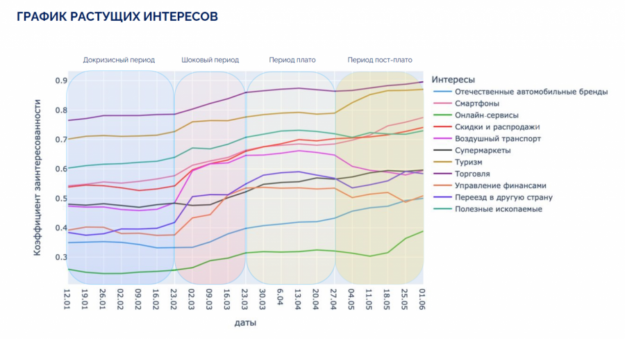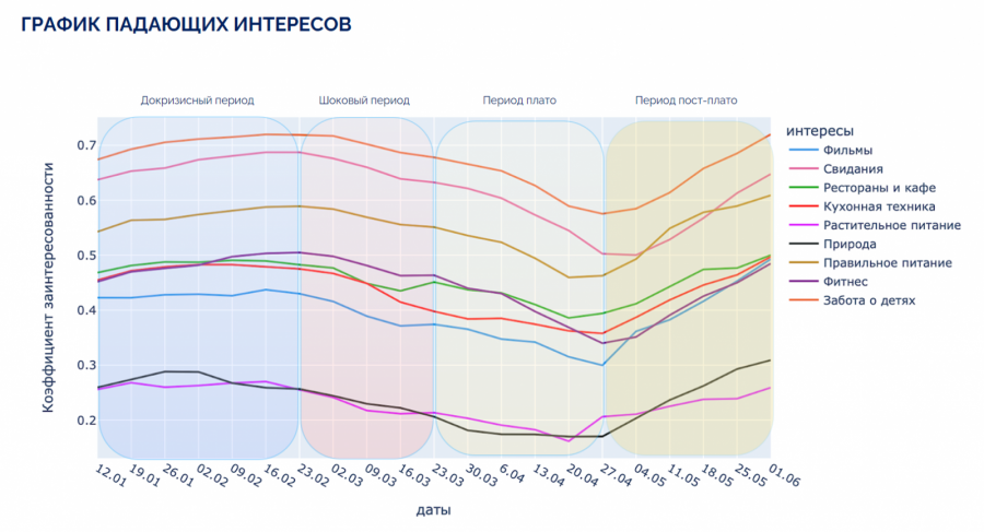 В период с конца февраля до конца апреля наблюдалось резкое снижение ряда интересов, преимущественно в области развлечений и отдыха. При этом в мае большая часть из них начала обратный рост, компенсируя падение и возвращаясь к докризисным значениям.