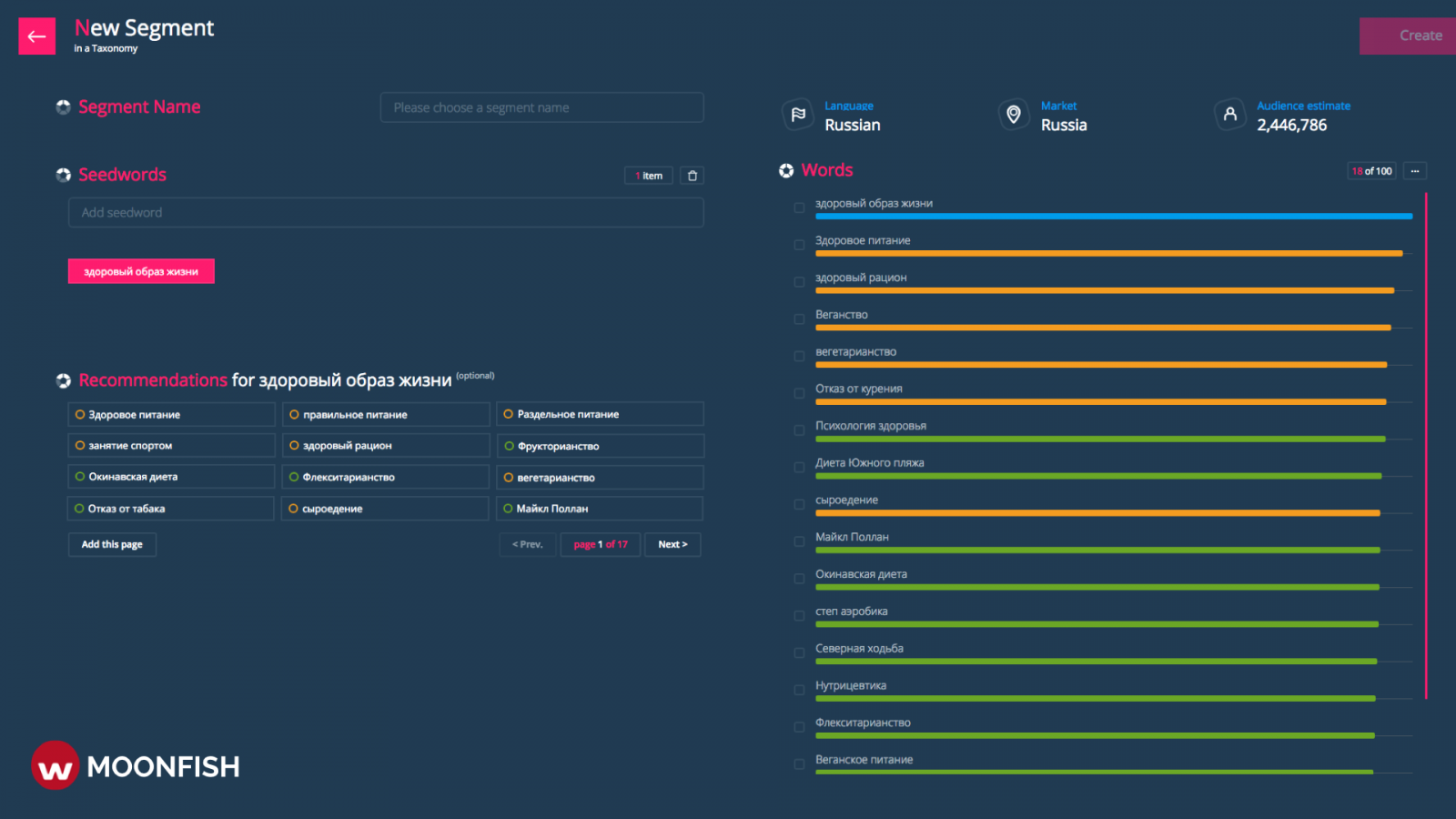 Ключевой принцип MoonFish при построении аудитории для таргетинга — прозрачность природы создаваемого сегмента. Рекламодатели могут самостоятельно определить до уровня конкретных слов и словосочетаний, какие темы соответствуют интересам целевой аудитории, и включить их в аудиторный сегмент.
