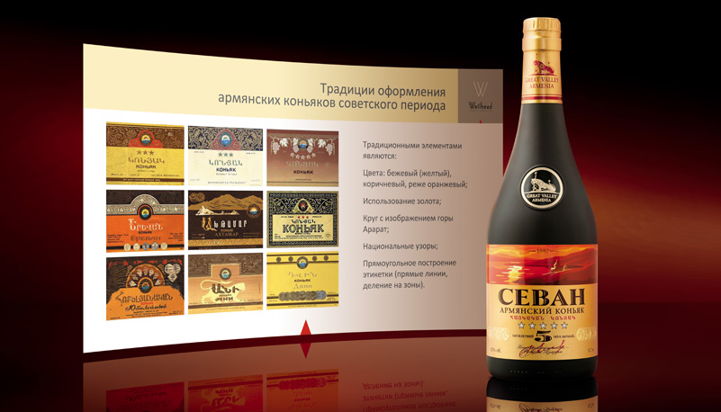 «В разработке упаковки необходимо было, используя традиционную символику армянских коньяков, создать более лаконичный стиль, придающий бренду солидности и узнаваемости, одновременно отстраивающий бренд «Севан» от большого числа золотых «арочных» этикеток» - рассказывает арт-директор Wellhead Ярослав Железняков.