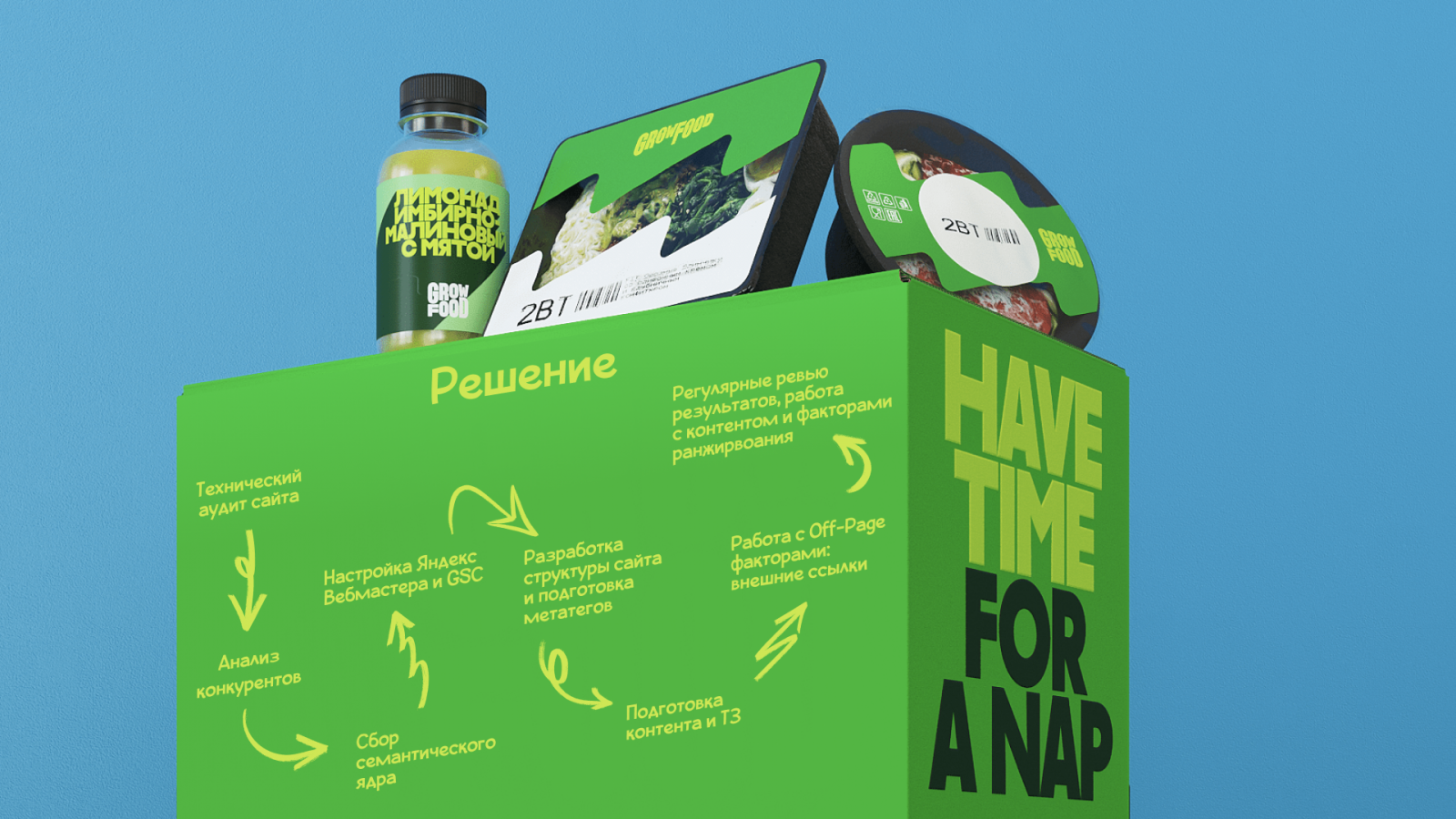 Grow Food — компания в сегменте доставки готового полезного питания. Бизнес активно развивается, расширяя географию присутствия, включая регионы России. Ее аудитория — люди, которые выбирают здоровое питание и ценят удобство готовых решений. Для продвижения нужно было нарастить органический трафик на сайт, улучшить позиции в поисковой выдаче и запустить новое контентное направление.