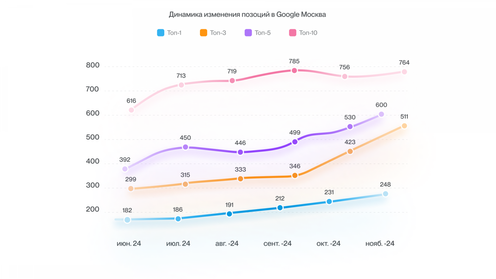 При этом SEO-рост не ограничивается отдельными регионами — продвижение охватывает всю Россию. Однако Москва и Санкт-Петербург остаются основными индикаторами успешности, поскольку именно они генерируют наибольший объем трафика. Поэтому отчетность и основной акцент в работе строится на динамике позиций в этих городах. Разрез по мобильным и десктопным версиям сайта позволяет оперативно реагировать на возможные технические нюансы: если, например, позиции на мобильных устройствах падают, а на десктопе растут, можно точечно доработать мобильную версию.