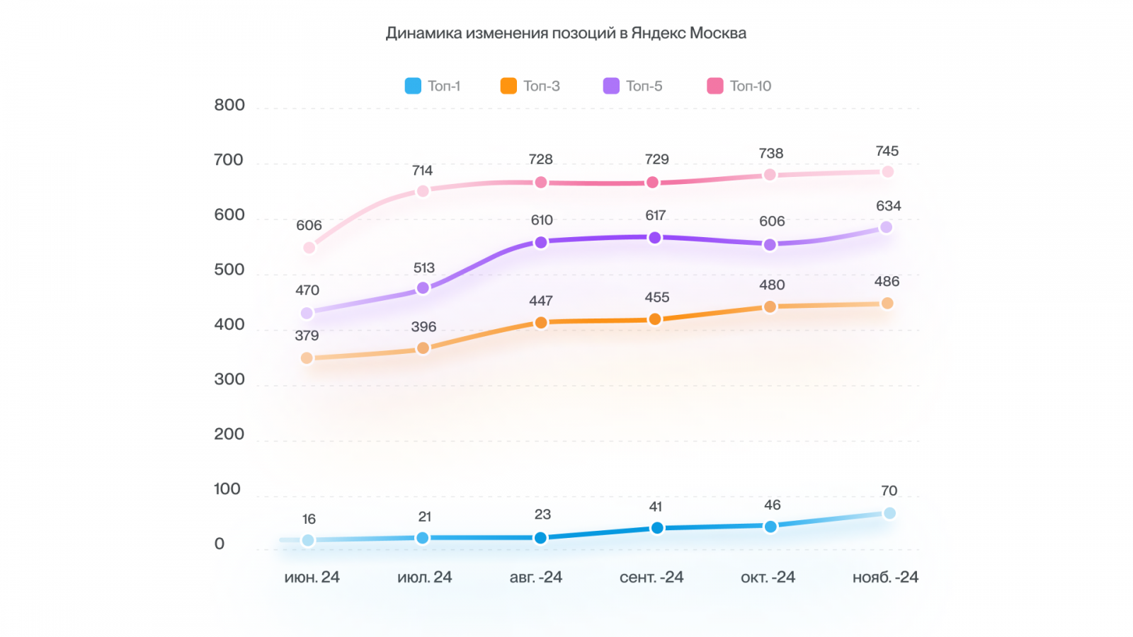 Видимость выбрана ключевой метрикой, поскольку она позволяет объективно оценивать, какую долю доступного трафика компания утилизирует на рынке, независимо от сезонных колебаний или изменения общего спроса. Этот показатель обеспечивает понимание долгосрочной динамики и коррелирует с ростом органического трафика. Стратегия работы с видимостью гарантирует, что сайт стабильно удерживает и улучшает свои позиции, создавая условия для дальнейшего роста.