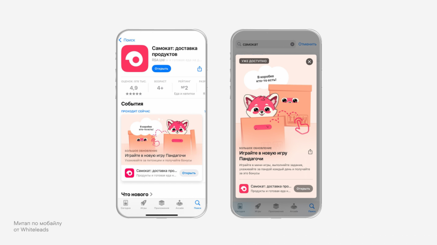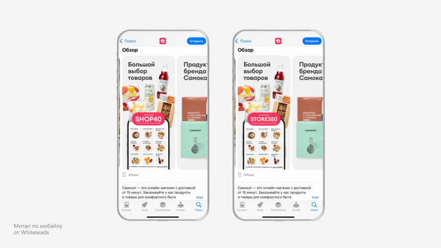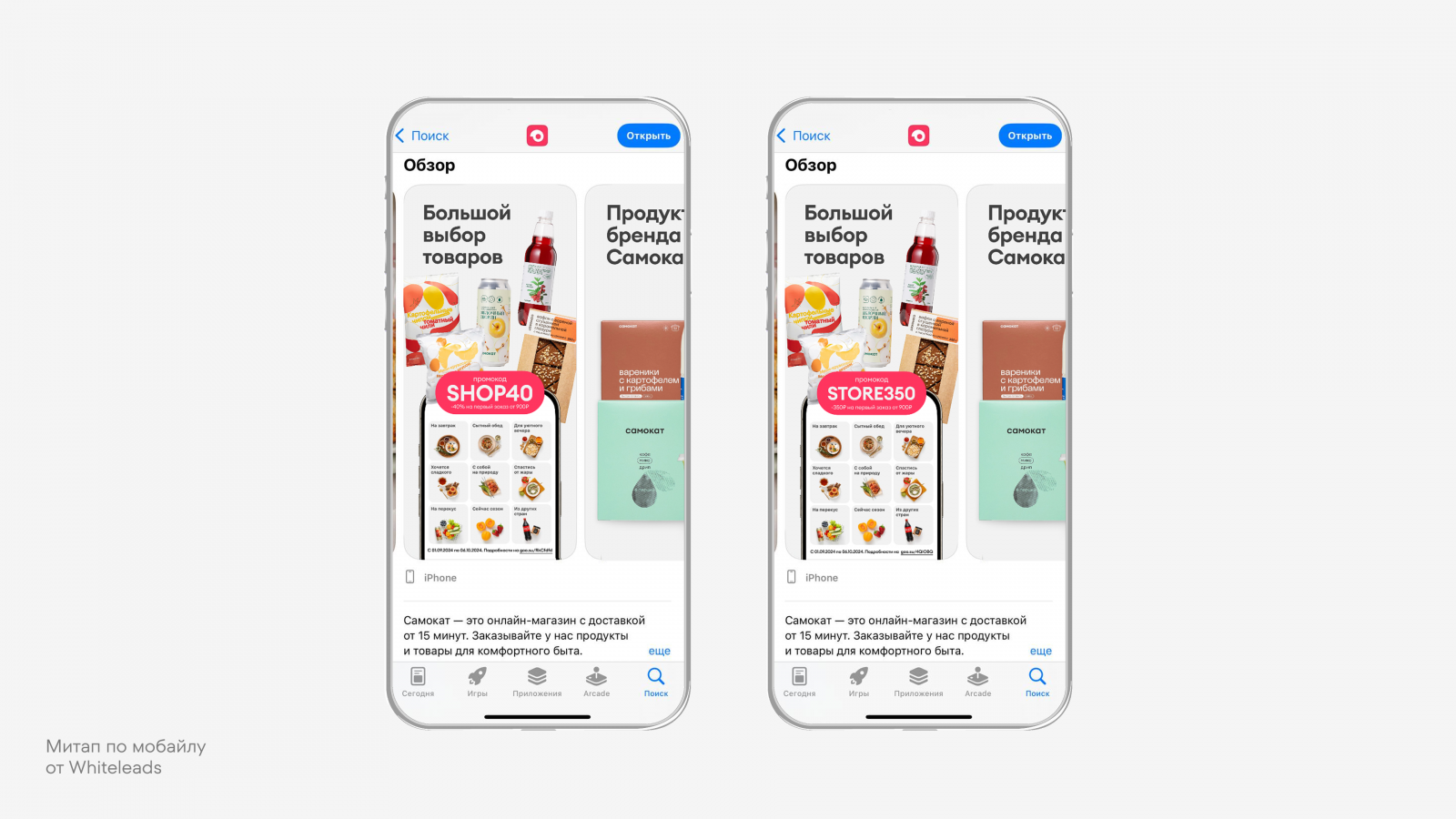 Персонализированные страницы в сторах для разных аудиторий. В «Самокате» сумели адаптировать посадочные в сторах под разные медийные кампании и сегменты аудитории: разные ссылки перехода из рекламных кампаний — разные посадочные в сторах.