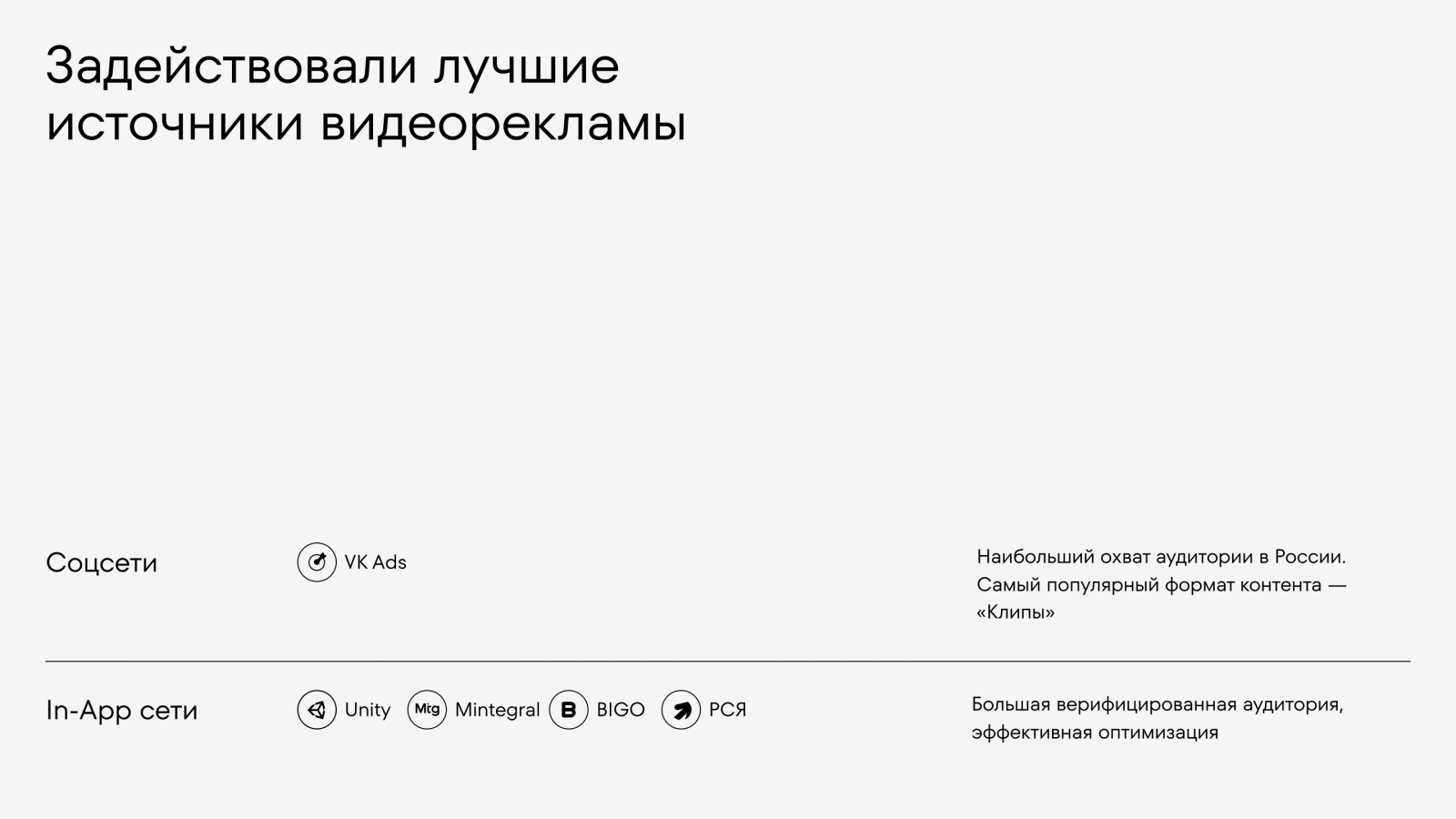 Whiteleads в первую очередь запустил рекламу в соцсетях, а именно в «VK Клипах» — самом большом плейсменте вертикальных видео в России с >30 млн DAU. В первый же месяц агентство привлекло из источника больше 300 тысяч пользователей в приложение «Джума».