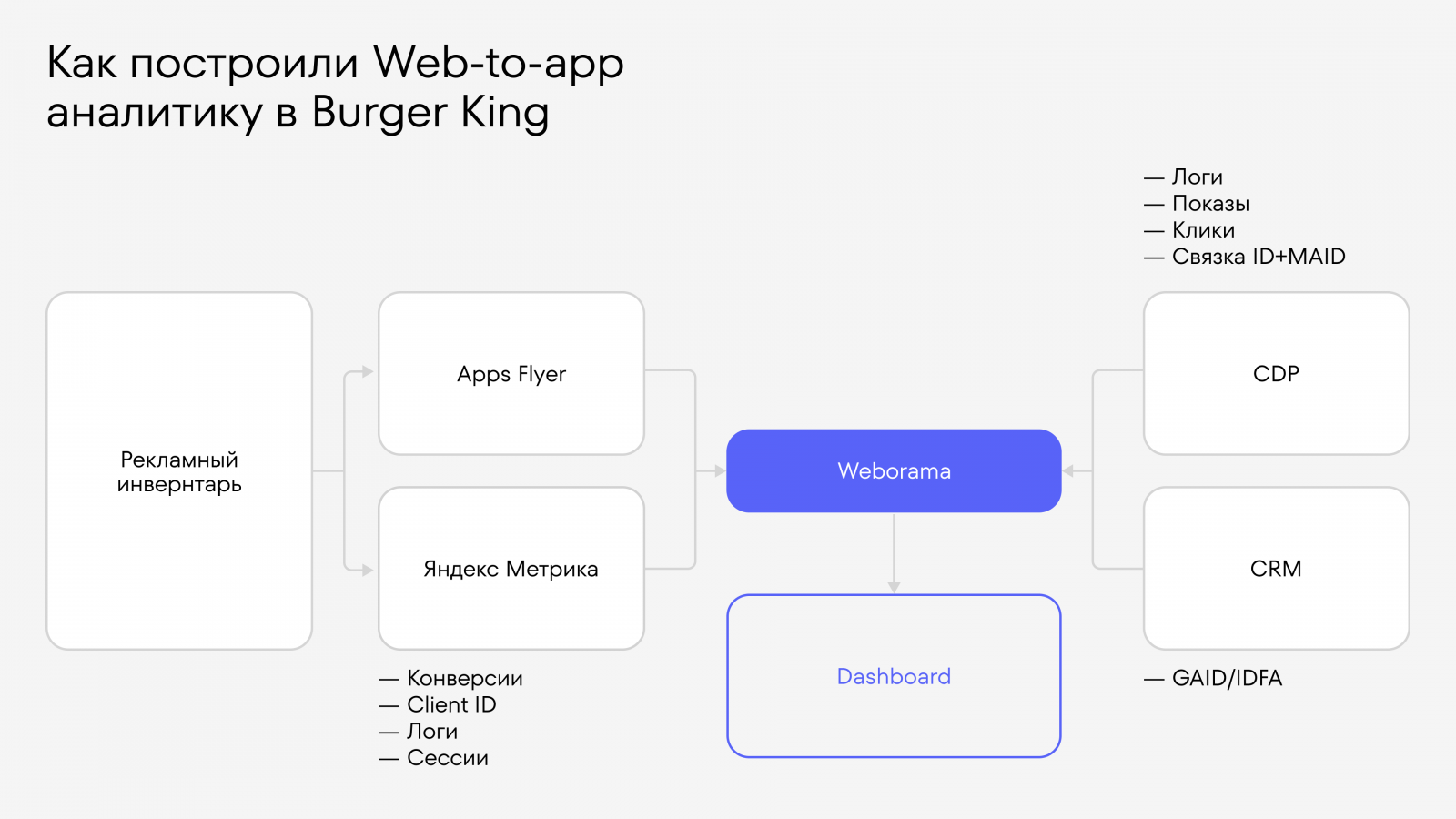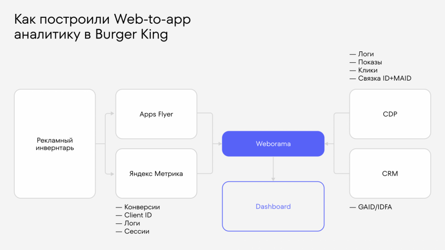 Когда появился общий идентификатор, то нужно было в едином сервисе аналитики связать все знания о клиенте, например: установки, заказы, клики на рекламу, GAID и IDFA из внутренней CRM, связку ID+MAID из CDP-системы. В Burger King все данные соединили в сервисе аналитики Weborama. Как это работало: