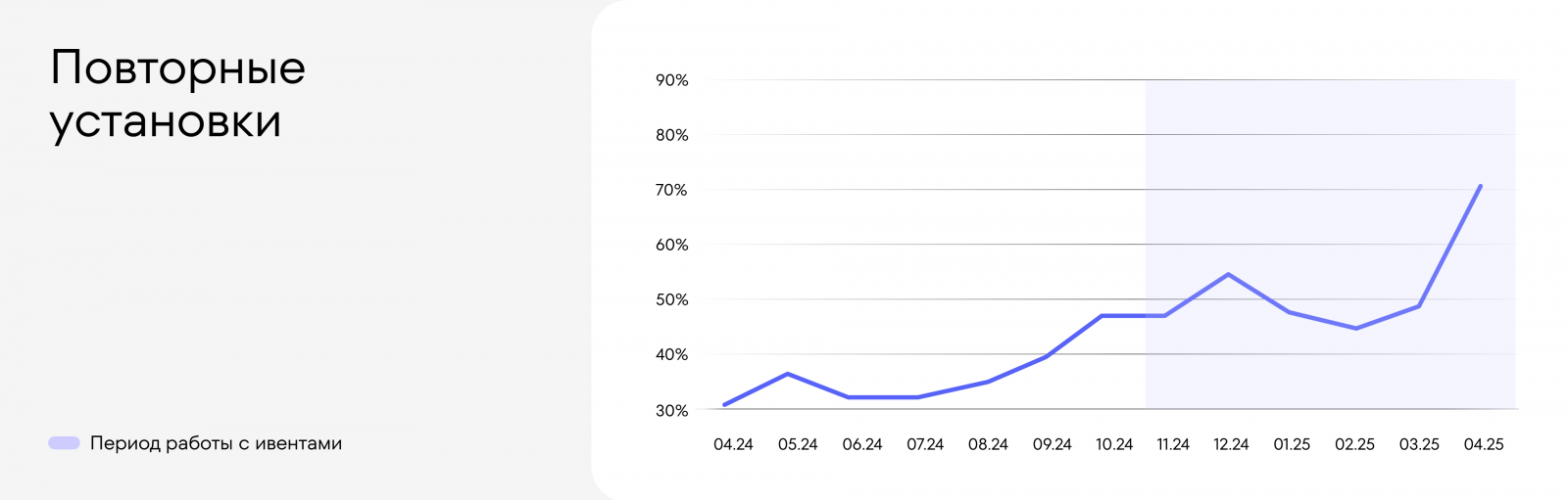 Вне зависимости от того, где была замечена реклама, пользователь переходит в стор, узнает информацию о приложении и скачивает его. И в этот момент важно, чтобы клиент точно понимал, зачем ему нужно приложение — какие потребности он может с ним закрыть. Для этого мы запустили AB-тесты, чтобы найти наиболее эффективные форматы клиентских скидок, а также персонализировали страницы в сторах для разных аудиторий и запустили ивенты с информацией о важных обновлениях и предложениях.