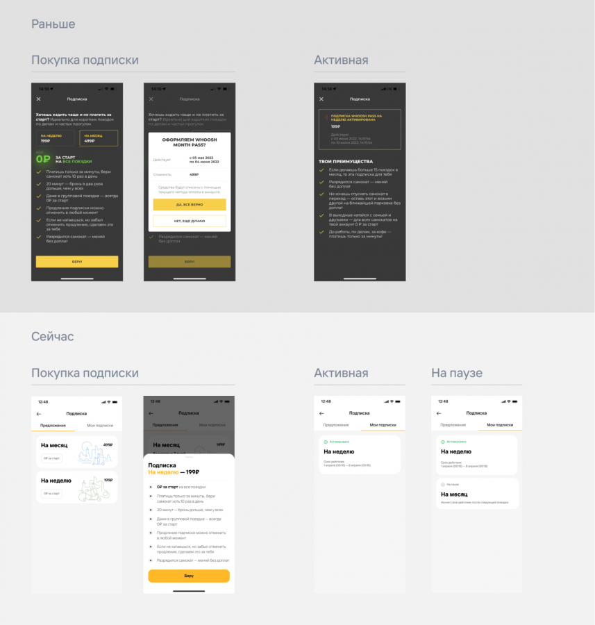 Теперь войти и зарегистрироваться легче, в карточке самоката отражены все важные характеристики, стоимость поездки сразу считается с учетом промокодов, а управление подписками становится более интуитивным.