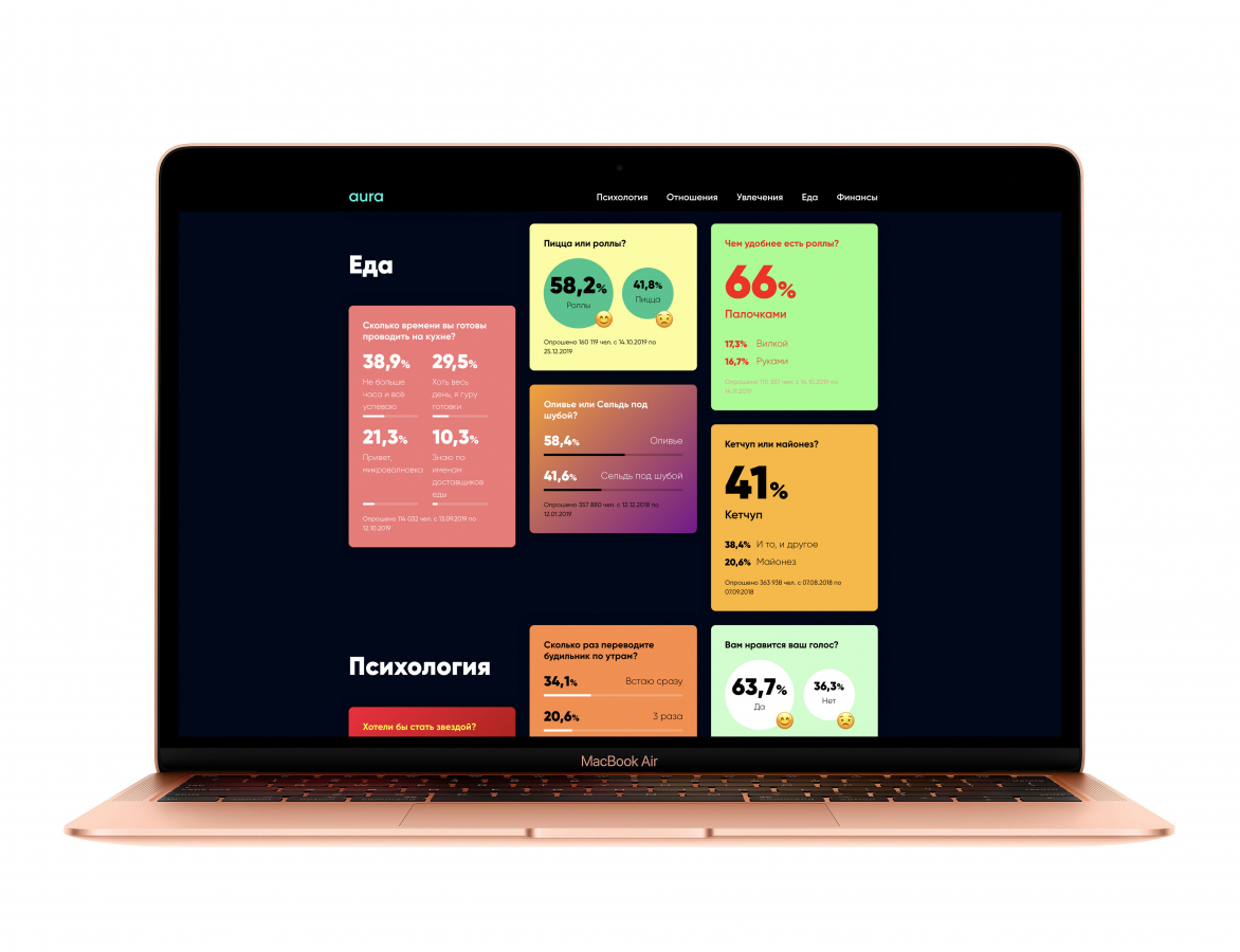 Мы планируем развивать проект AURA как отдельное медиа, поэтому не только переработали визуальную составляющую, но и поработали над концепцией. Предыдущий вариант платформы морально устарел. Пользователи не понимали, как ответили другие люди и лендинг с ответами был, мягко говоря, не самым удобным для восприятия информации.