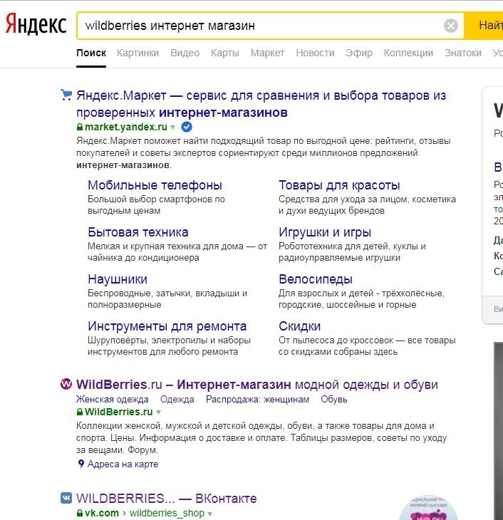 Тем не менее, с сегодняшнего дня при вводе «Wildberries» в поисковую строку «Яндекса» в выдаче второй строкой стал отображаться сайт «Яндекс. Маркет», который ранее не занимал данную позицию, а при поиске «Wildberries — интернет-магазин» «Яндекс. Маркет» уже занимает первую строку, а «Wildberries» — только вторую.
