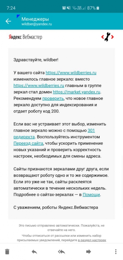 По словам представителей магазина, в 5 утра пришло сообщение об изменении зеркала сайта с www.wildberries.ru на «Яндекс.Маркет» market.yandex.ru. В «Яндекс» на обращение ритейлера ответили, что это является ошибкой и пообещали все исправить.
