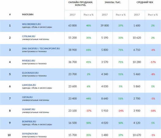 Второе место рейтинга Data Insight занял Citilink, третье — DNS. На четвертом месте — онлайн-витрина «М.Видео», на пятом — «Эльдорадо». Самые большие темпы роста показали DNS (рост выручки 61%), Vseinstrumenti.ru (71%), Ozon.ru (44%) и Re-Store (71%). Онлайн-витрина магазина ЦУМ показала прирост в 120%, универсальный онлайн-магазин 123.ru вырос ровно в два раза.