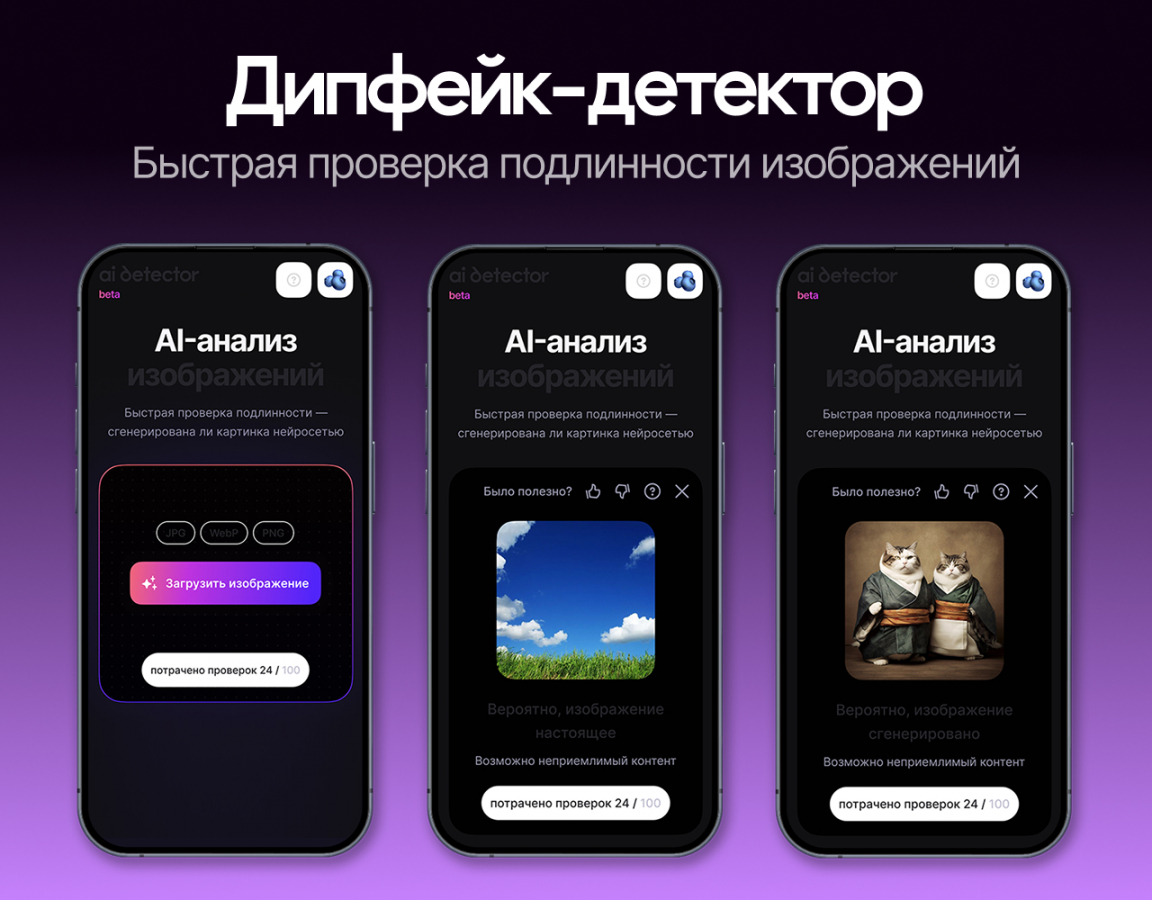 Бета-версия сервиса бесплатна для пользователей, на старте каждому доступно 100 проверок в месяц. В ходе открытого тестирования команда РВБ планирует выявить недочеты и доработать продукт перед его дальнейшим развитием. Планируется, что детектор позволит анализировать не только изображения, но и аудио, видео и текст, отметили в компании.