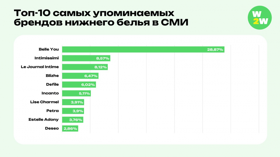 Рейтинг упоминаемости брендов нижнего белья в СМИ составляется коммуникационным агентством Win2Win Communications с 2023 года. В этом году были проанализированы материалы порядка 130 онлайн-изданий, где отслеживалась упоминаемость более 40 российских и зарубежных марок.